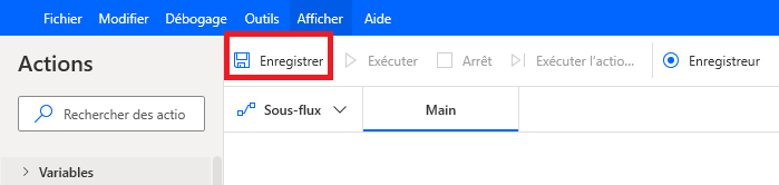 A : barre d’outils : comporte les opérations de base à utiliser avec les actions (Enregistrer, Annuler, Copier, Déboguer et Coller) et l’option Enregistreur permettant de démarrer l’enregistrement et de contrôler l’implémentation du processus (Démarrer/Interrompre/Arrêter).