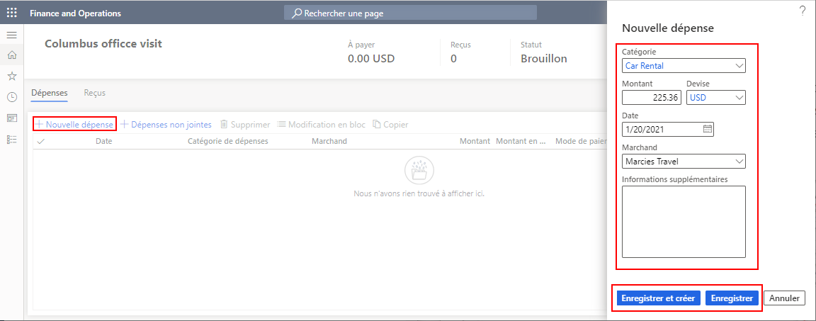 - Cliquez sur Enregistrer et créer pour saisir une nouvelle dépense ou sur Enregistrer pour revenir à la note de frais.