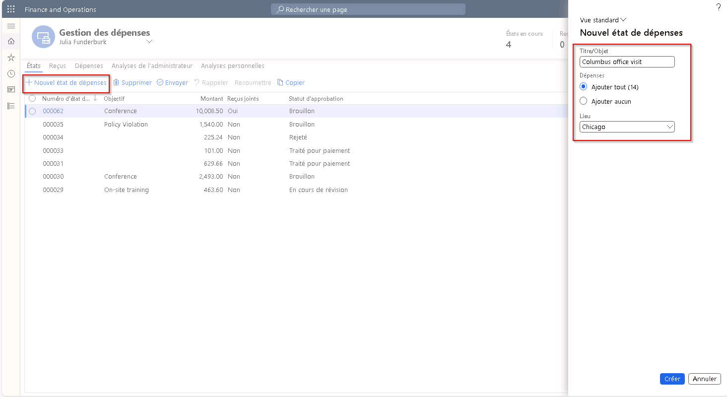 Pour créer une note de frais et ajouter des informations sur des dépenses, procédez comme suit :