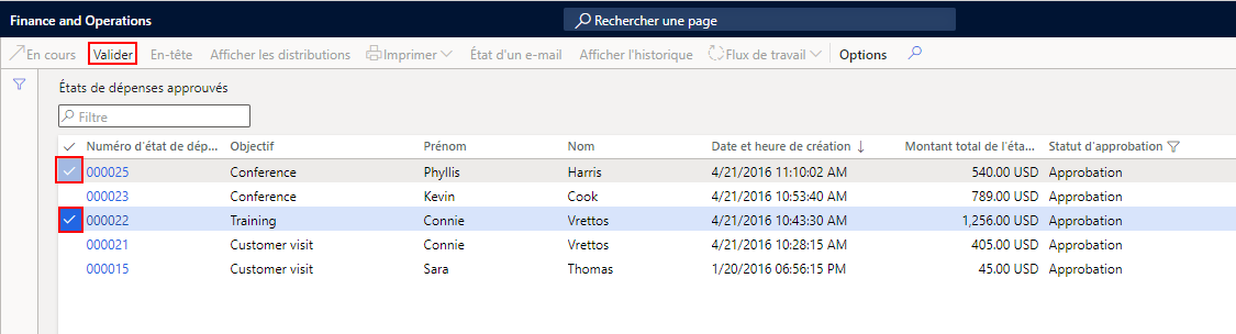 Une fois approuvée et transférée dans la feuille comptabilité, une note de frais peut être validée en comptabilité.