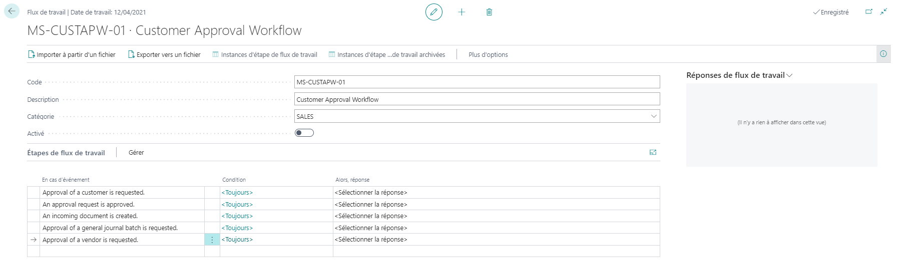 Sur la page Flux de travail, cliquez sur le champ Activé pour commencer à utiliser le flux de travail.