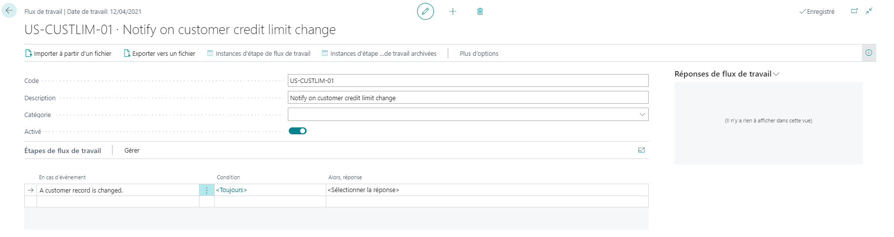 Dans le champ Description, saisissez Notifier le changement de crédit autorisé du client.
