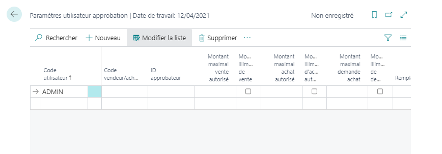 Créez une ligne sur la page Paramètres utilisateur approbation, puis remplissez les champs comme suit :