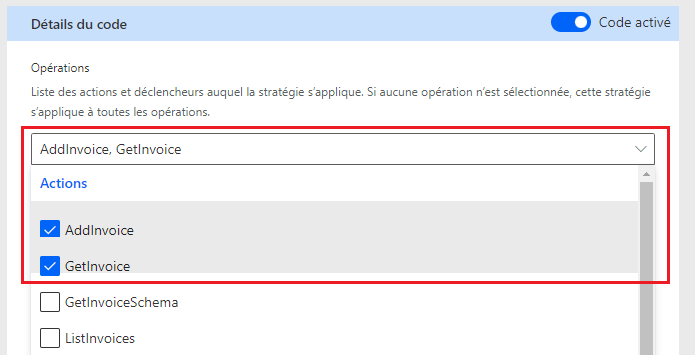 Vous pouvez également contrôler les opérations sur lesquelles le code personnalisé s’exécute en configurant celui-ci de façon à ce qu’il s’exécute pour des opérations spécifiques. Par défaut, une fois le code activé, toutes les opérations exécuteront le code personnalisé. L’image suivante montre que seuls AddInvoice et GetInvoice exécutent le code personnalisé.