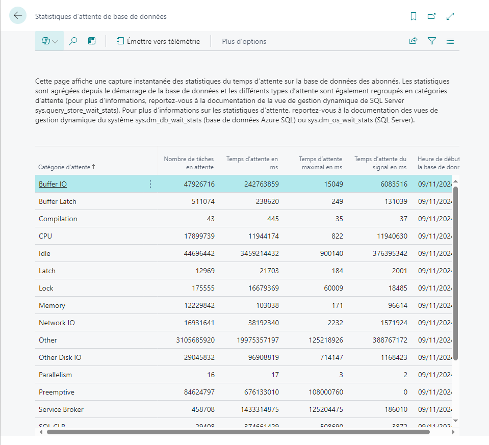 Vous pouvez vérifier les performances de votre base de données en consultant les informations fournies par la vue Statistiques d’attente de base de données dans Business Central.