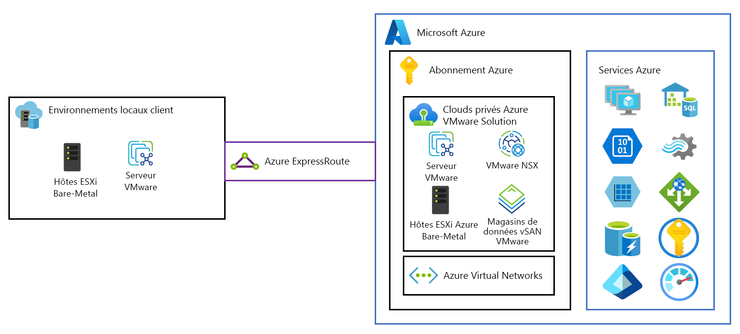 Les déploiements de logiciels et composants matériels de cloud privé Azure VMware Solution sont entièrement intégrés et automatisés dans Azure. Le diagramme suivant montre dans les grandes lignes la relation entre un environnement VMware local, Azure VMware Solution et tous les services Azure auxquels Azure VMware Solution peut se connecter.
