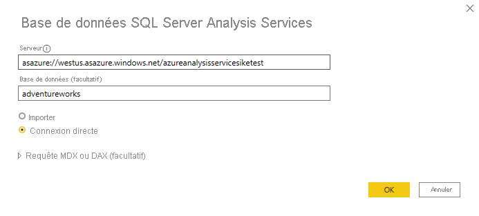 Comme mentionné précédemment, vous utilisez la fonctionnalité Obtenir les données dans Power BI Desktop. Quand vous sélectionnez Analysis Services, vous êtes invité à entrer l’adresse du serveur et le nom de la base de données avec deux options : Importer et Connexion directe.