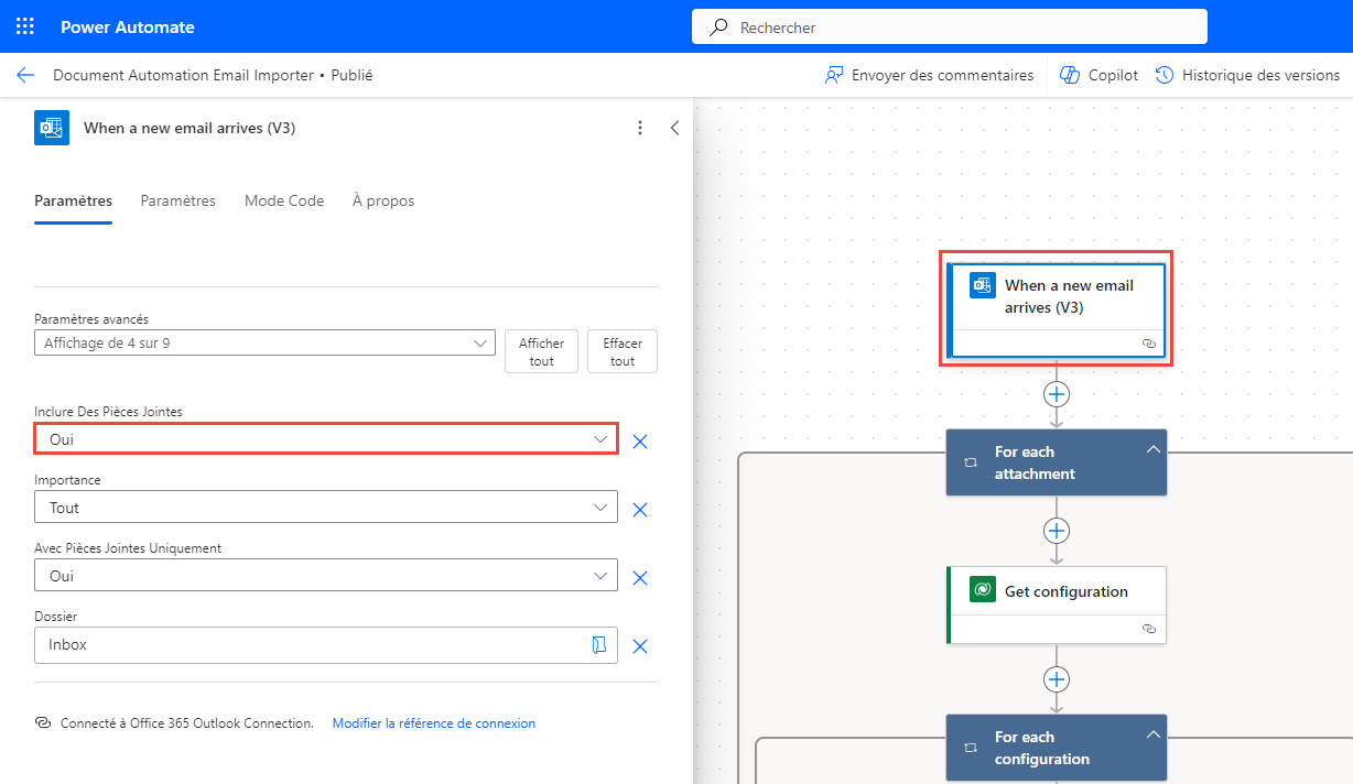 Vous êtes dans l’expérience de création de flux de l’outil d’importation d’e-mails. Ici, vous pouvez configurer les règles de messagerie pour filtrer les e-mails spécifiques que vous souhaitez traiter. Vous devez laisser la propriété Inclure les pièces jointes définie sur Oui, car ce flux prend le document en pièce jointe comme document à traiter. Mais vous pouvez configurer des filtres sur l’objet, les expéditeurs, etc., en fonction de vos besoins.