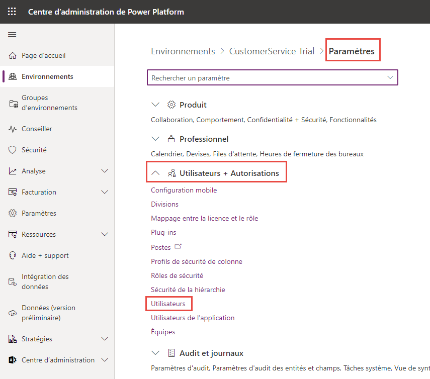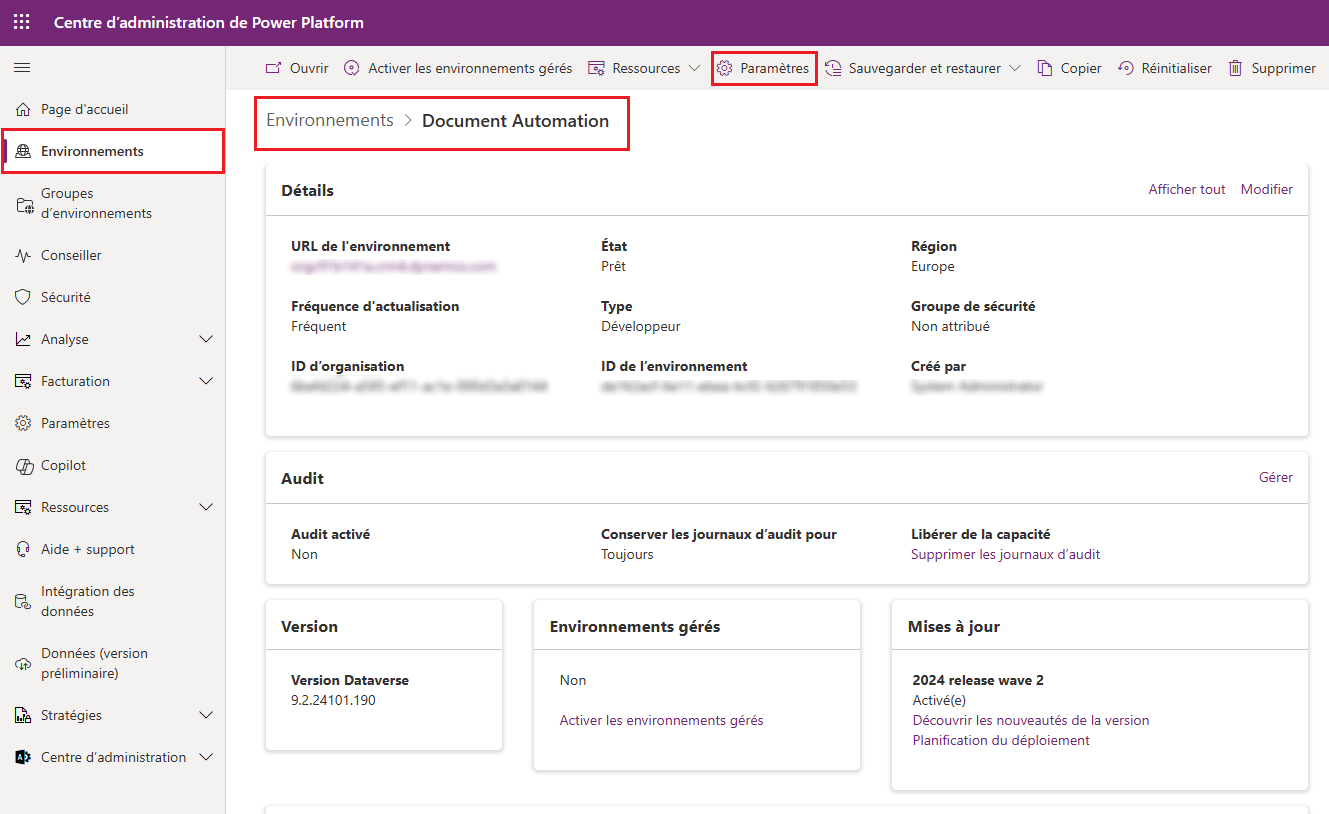 Ouvrez le Centre d’administration Microsoft Power Platform et sélectionnez votre environnement, puis cliquez sur Paramètres en haut.