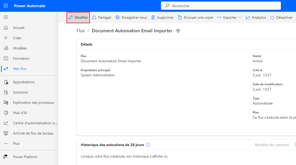 Ensuite, sélectionnez Outil d’importation d’e-mails de l’automatisation de documents, puis cliquez sur Modifier dans la bannière supérieure de la page Détails du flux.