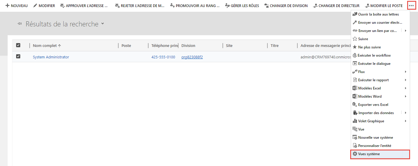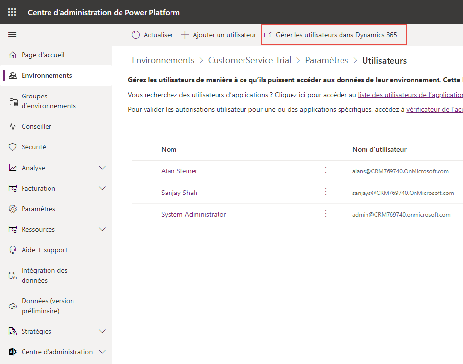 Cliquez sur Gérer les utilisateurs dans Dynamics 365 dans le ruban supérieur.