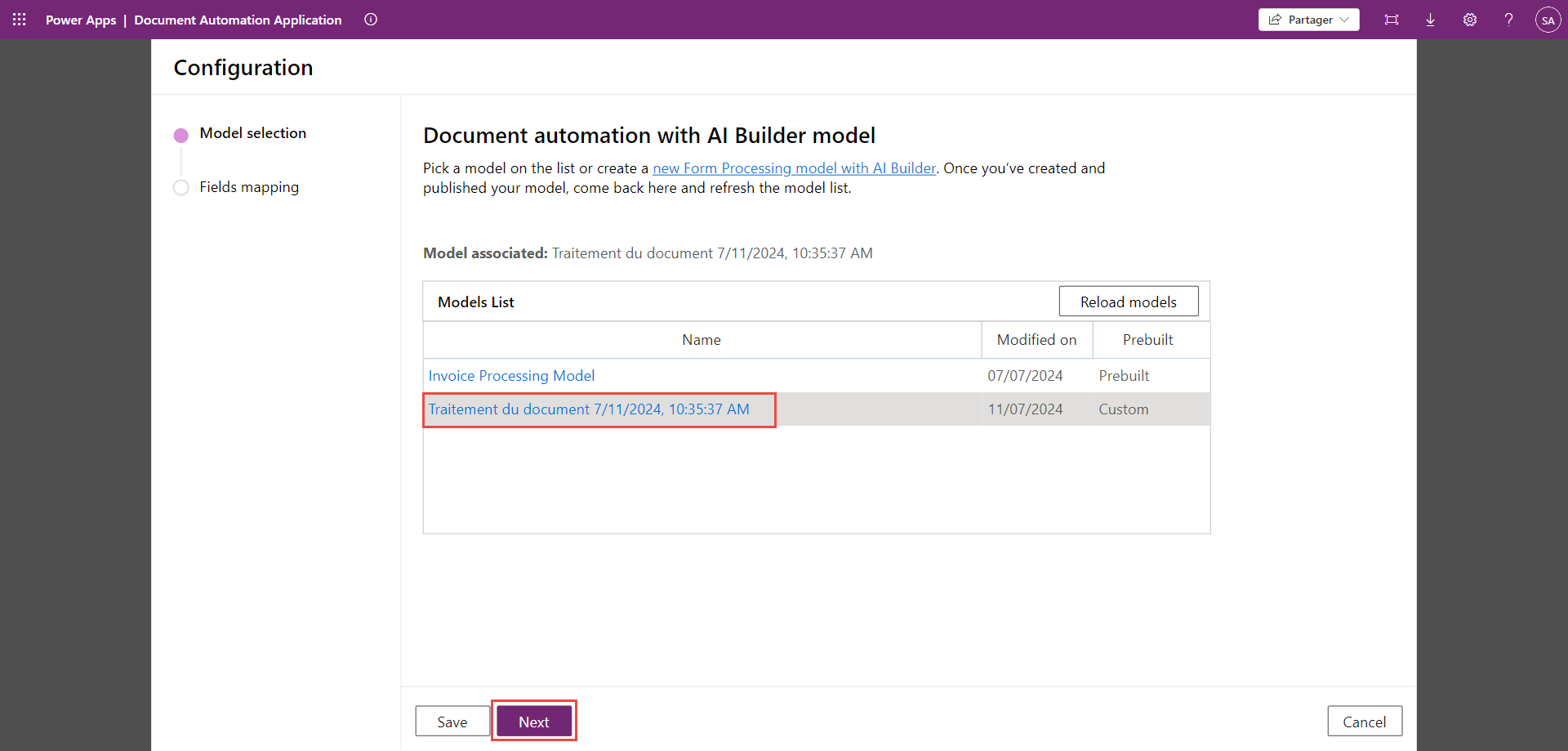 Vous devez maintenant sélectionner un modèle AI Builder pour extraire les libellés des documents.