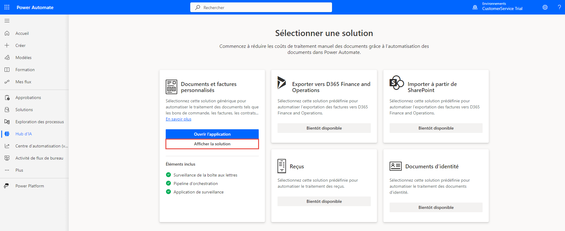 Vous pouvez personnaliser le traitement des e-mails en cliquant sur Afficher la solution sous Documents et factures personnalisés dans l’onglet Traitement des documents du Hub d’IA.