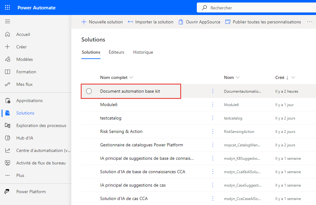 Si vous obtenez l’erreur suivante : L’enregistrement spécifié est introuvable. Réponse du serveur : Échec des configurations de l’automatisation de documents : L’entité « aib_documentautomationconfiguration » n’existe pas, vous devez créer une solution non gérée dans le même environnement, puis ajouter l’application Automatisation de documents existante et exécuter l’application à partir de la solution non gérée.