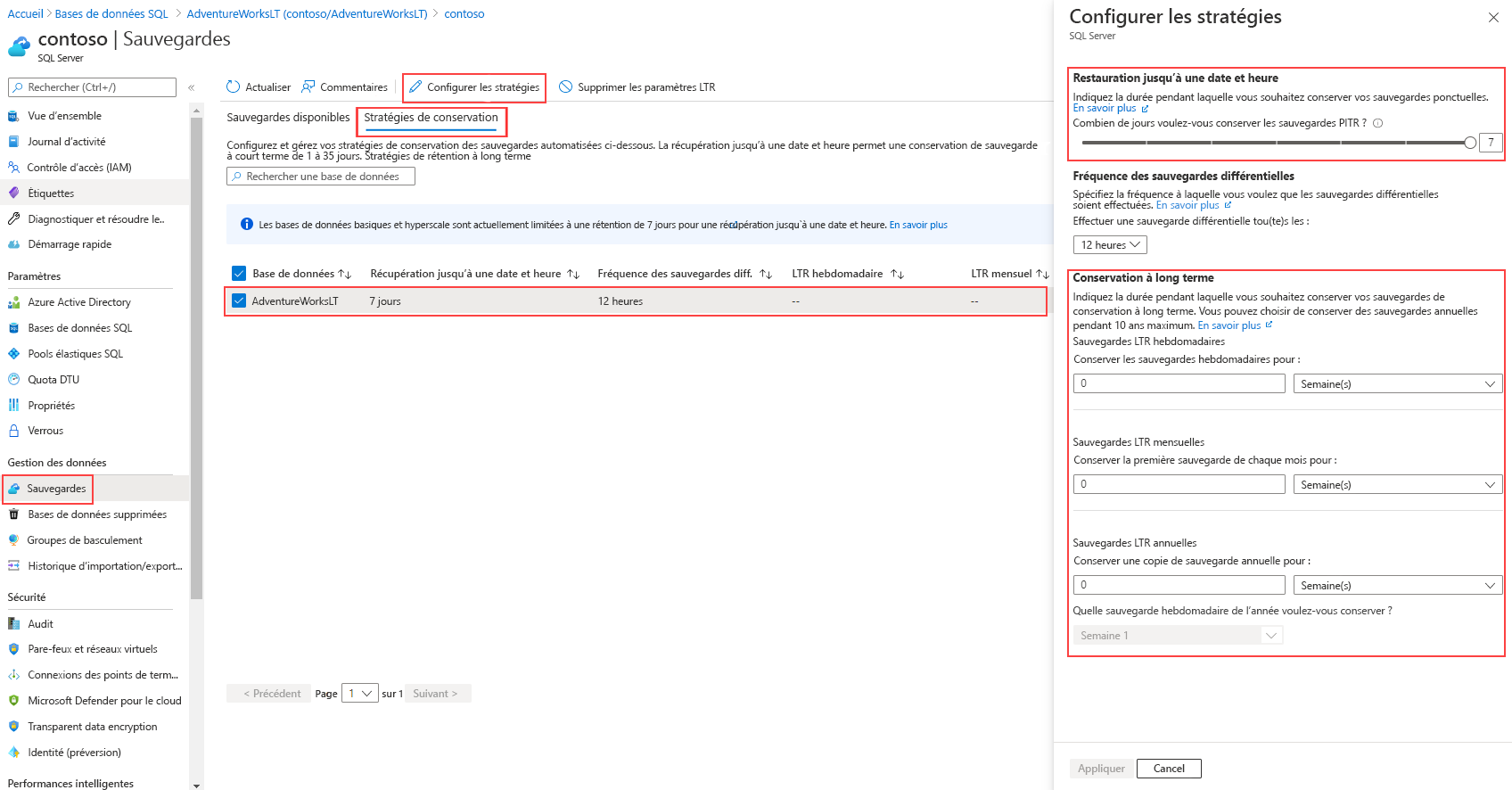 Vous permet de configurer une stratégie de rétention à un instant dans le passé spécifique pour chaque base de données, allant de 1 à 35 jours (la valeur par défaut est de sept jours). Vous pouvez également restaurer des bases de données à un instant dans le passé spécifique au sein du même serveur à l’aide du Portail Azure, de PowerShell, de l’interface CLI ou de l’API REST.