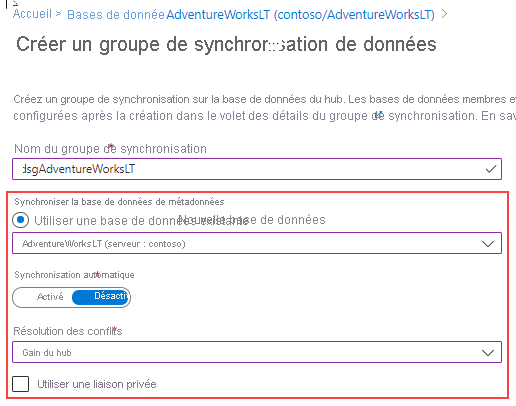 Lors de la création d’un groupe de synchronisation, vous devez spécifier une base de données pour y stocker les métadonnées du groupe de synchronisation. Cette base de données de métadonnées peut être nouvelle ou existante, mais elle doit résider dans la même région que votre groupe de synchronisation.