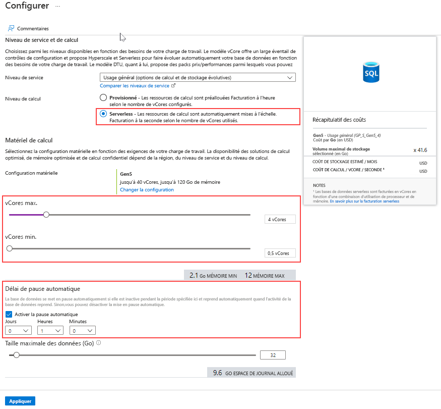 Ce niveau est adapté aux environnements de développement et de test, où les charges de travail peuvent être imprévisibles. Avec le mode serverless, vous pouvez configurer des vCores minimum et maximum, ce qui permet à la base de données d’ajuster ses ressources de manière dynamique. Malgré son nom, le niveau de calcul serverless nécessite un serveur pour héberger votre base de données.