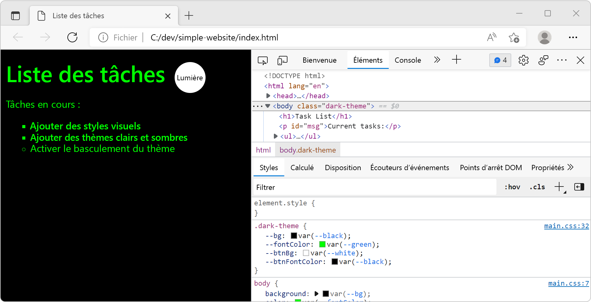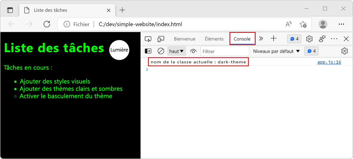 Dans le code précédent, vous avez utilisé la méthode toggle pour modifier l’attribut class de l'élément <body>. Cette méthode ajoute ou supprime automatiquement les classes light-theme et dark-theme. Ce code applique les styles sombres au lieu des styles clairs si vous cliquez, et inversement si vous cliquez à nouveau.