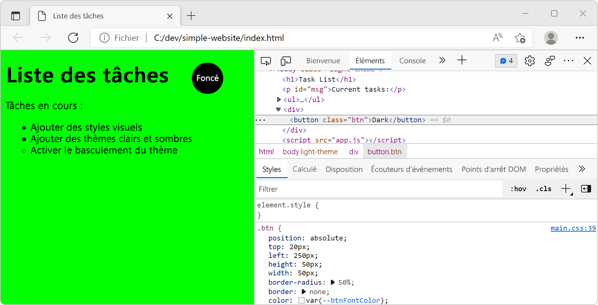 main.css), ajoutez une nouvelle règle avec un sélecteur de classe.btnpour votre bouton HTML. Pour que les couleurs du bouton soient différentes de celles du thème clair ou sombre général, définissez les propriétéscoloretbackground-colordans cette règle. Lorsque votre page s'affiche, ces propriétés.btnremplacent les propriétés par défaut définies dans la règlebodyde votre fichier CSS..btn { color: var(--btnFontColor); background-color: var(--btnBg); }Ensuite, modifiez la règle
