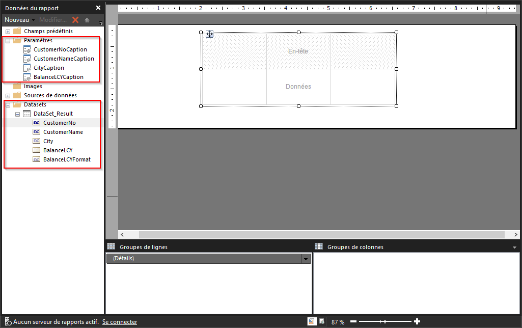 Si vous souhaitez utiliser la valeur Légende d’un champ comme libellé sur une présentation d’état, vous devez inclure la légende dans le jeu de données. Lorsque vous ajoutez des champs de table au jeu de données, vous pouvez définir la propriété IncludeCaption sur true pour spécifier que la légende du champ est également ajoutée au jeu de données. Si vous n’incluez pas la légende dans le jeu de données, vous ne pouvez pas utiliser les légendes multilingues dans une application multilingue comme libellés dans l’état.