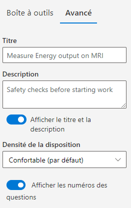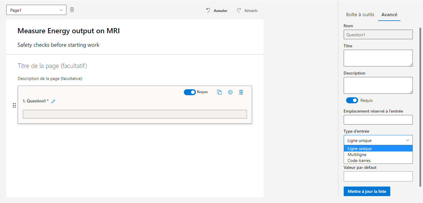 Ensuite, vous pouvez faire glisser les types de questions de la boîte à outils dans le volet droit, puis les déplacer dans le canevas d’inspection. Les types de questions suivants sont disponibles :