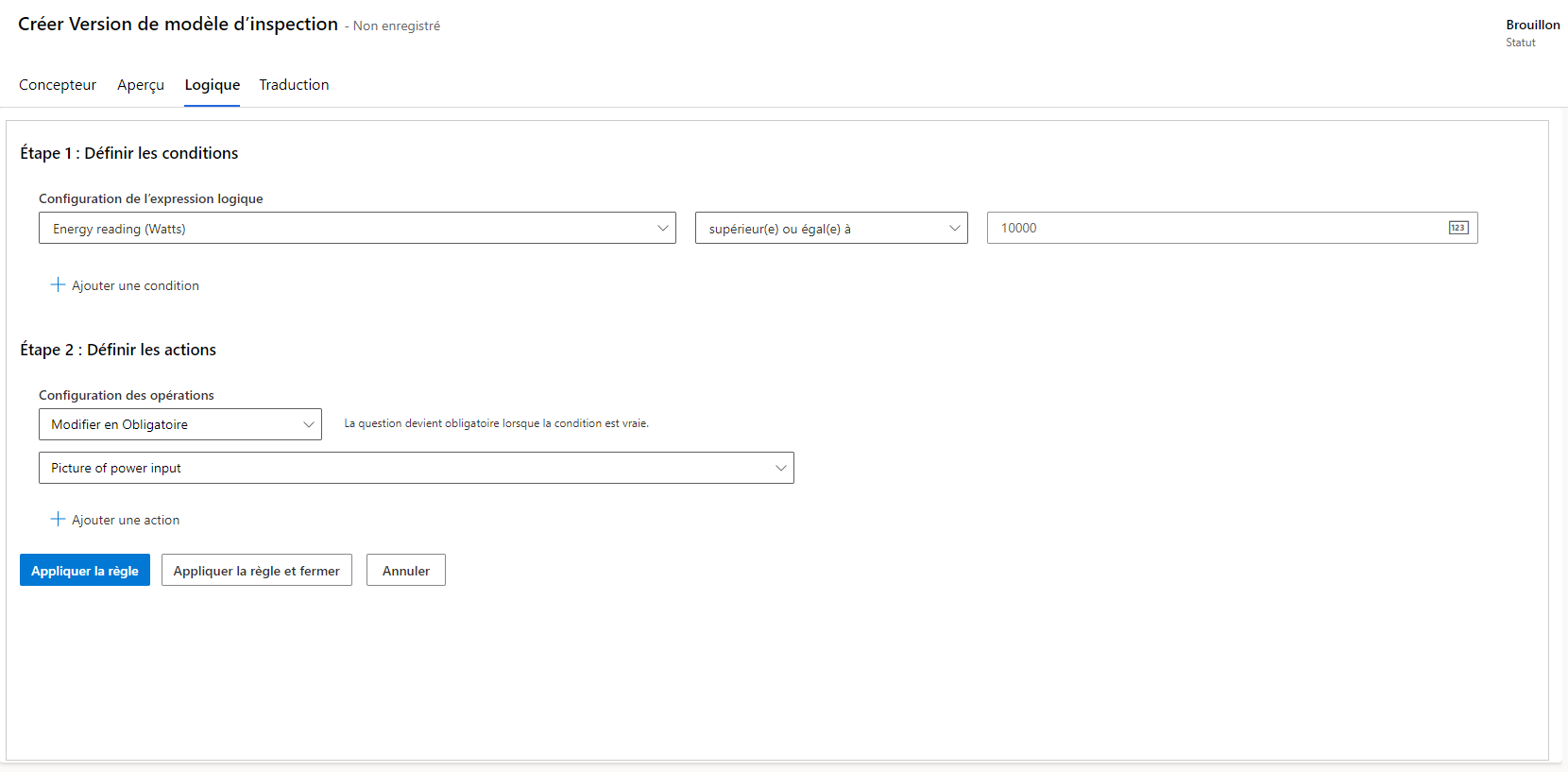 L’onglet Logique du formulaire d’inspection vous permet d’ajouter des règles pour contrôler le flux de questions dans l’inspection.