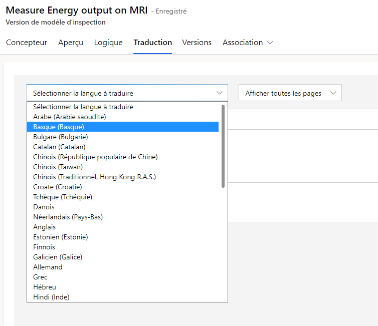 Vous pouvez ajouter des variantes linguistiques pour chaque inspection. Dans une inspection, sélectionnez l’onglet Traduction du formulaire, sélectionnez une langue dans la liste déroulante, puis ajoutez la traduction pour chaque question.