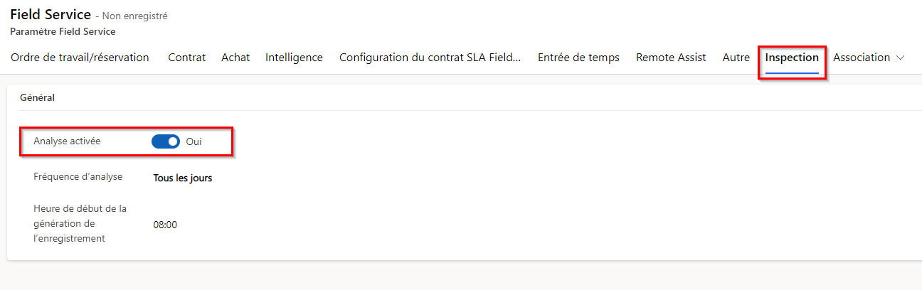 Assurez-vous d’activer l’analyse des inspections pour l’exécution de ces flux. Pour activer l’analyse, accédez à Paramètres > Général > Paramètres de Field Service. Dans l’onglet Inspection, réglez le bouton bascule Analyse activée sur Oui, puis définissez le moment où les enregistrements des réponses devront être créés.