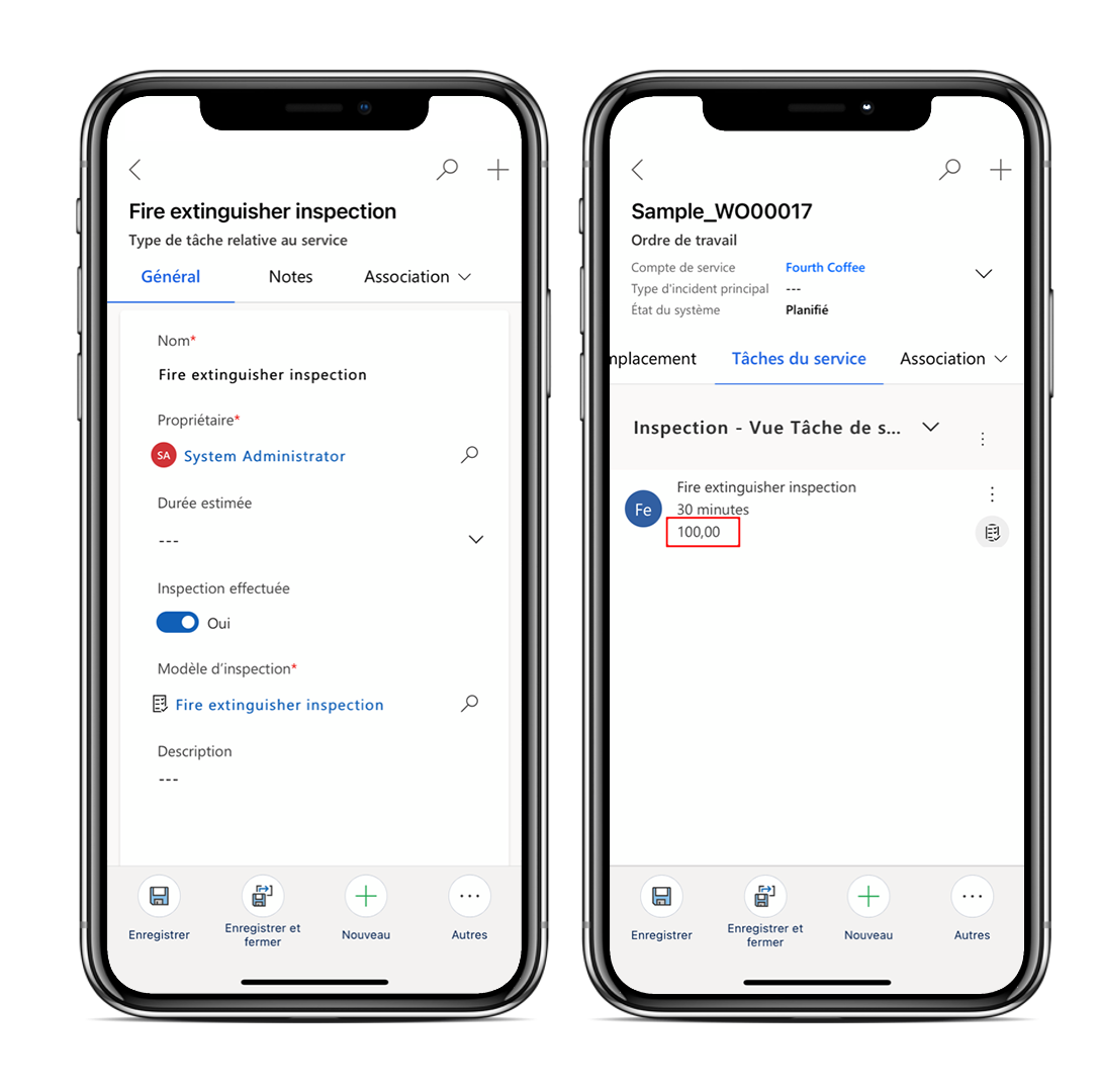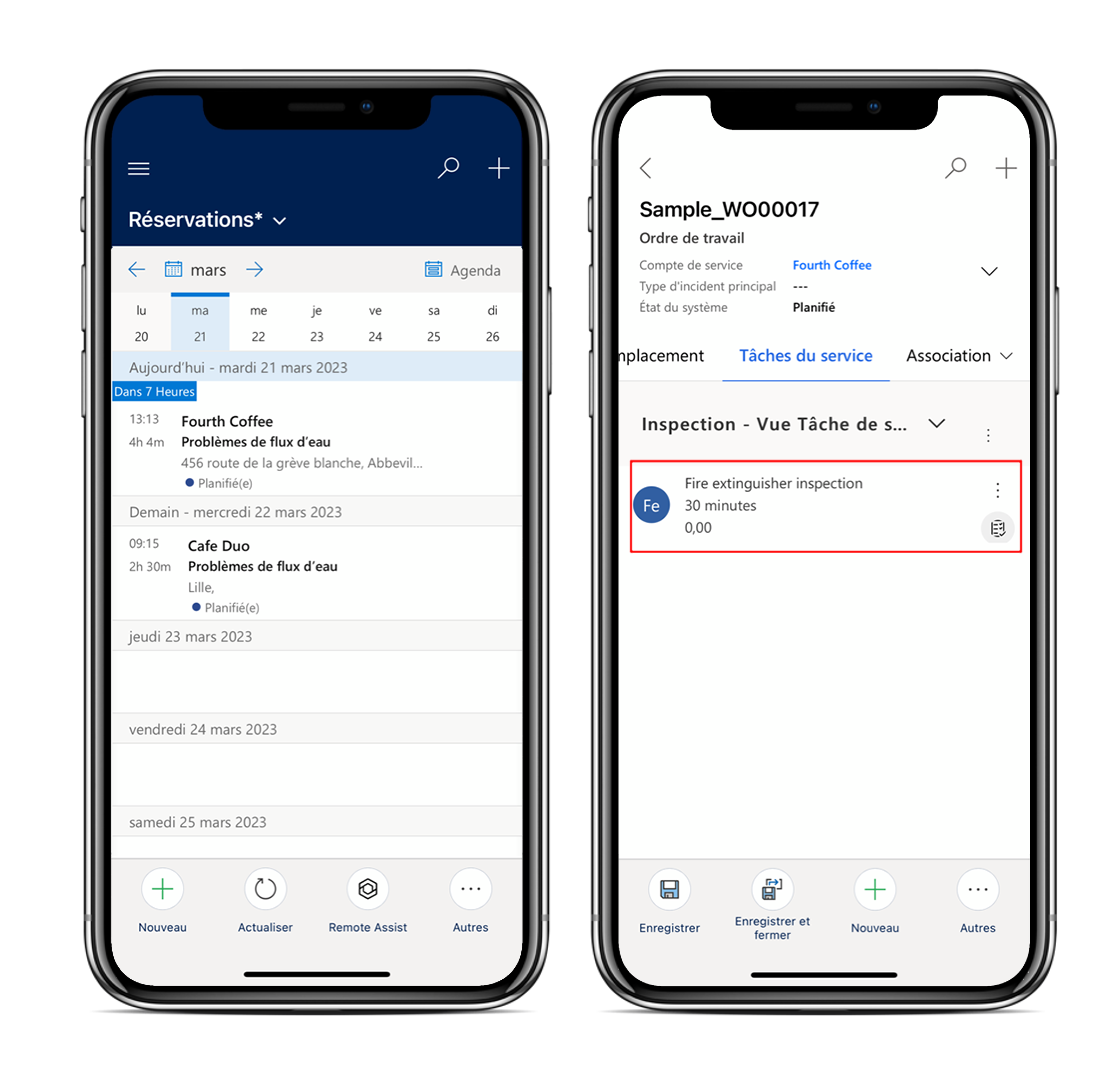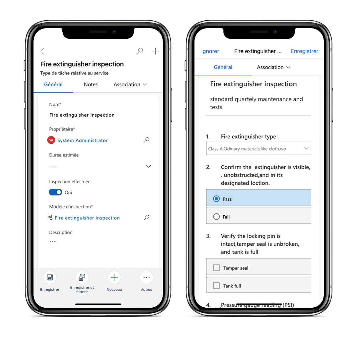 Les techniciens peuvent afficher et effectuer des inspections sur l’application mobile Field Service. Pour démarrer une inspection, le technicien peut sélectionner la tâche de service de l’ordre de travail à laquelle l’inspection est associée.