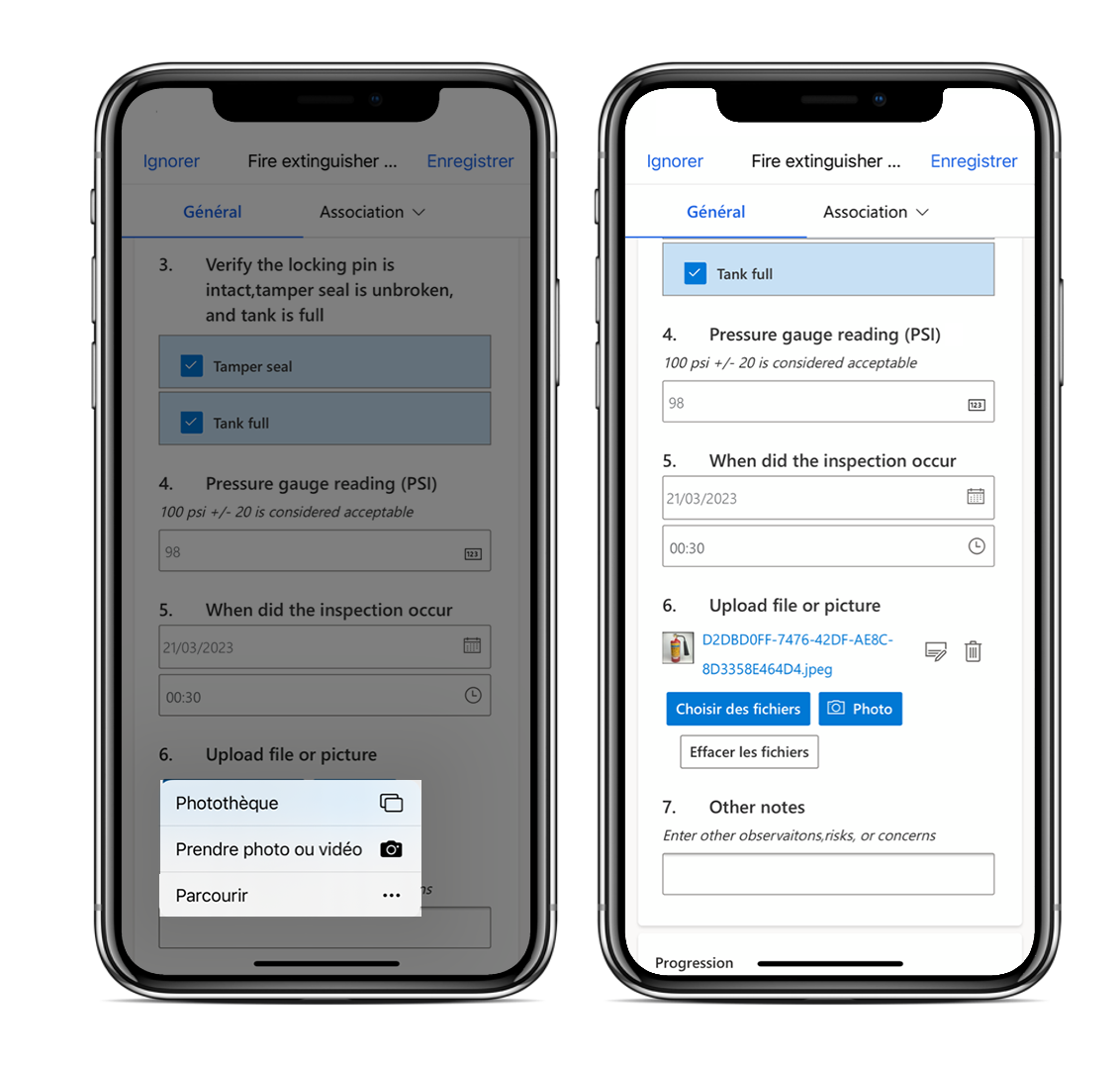 Pendant qu’un technicien effectue le travail, il peut sélectionner la tâche de service de l’ordre de travail à laquelle l’inspection est associée. Une fois l’inspection terminée, il peut charger des fichiers, prendre des photos ou en charger à partir de la pellicule de l’appareil photo du téléphone. De plus, le technicien peut ajouter des commentaires lors du chargement d’un fichier ou d’images.