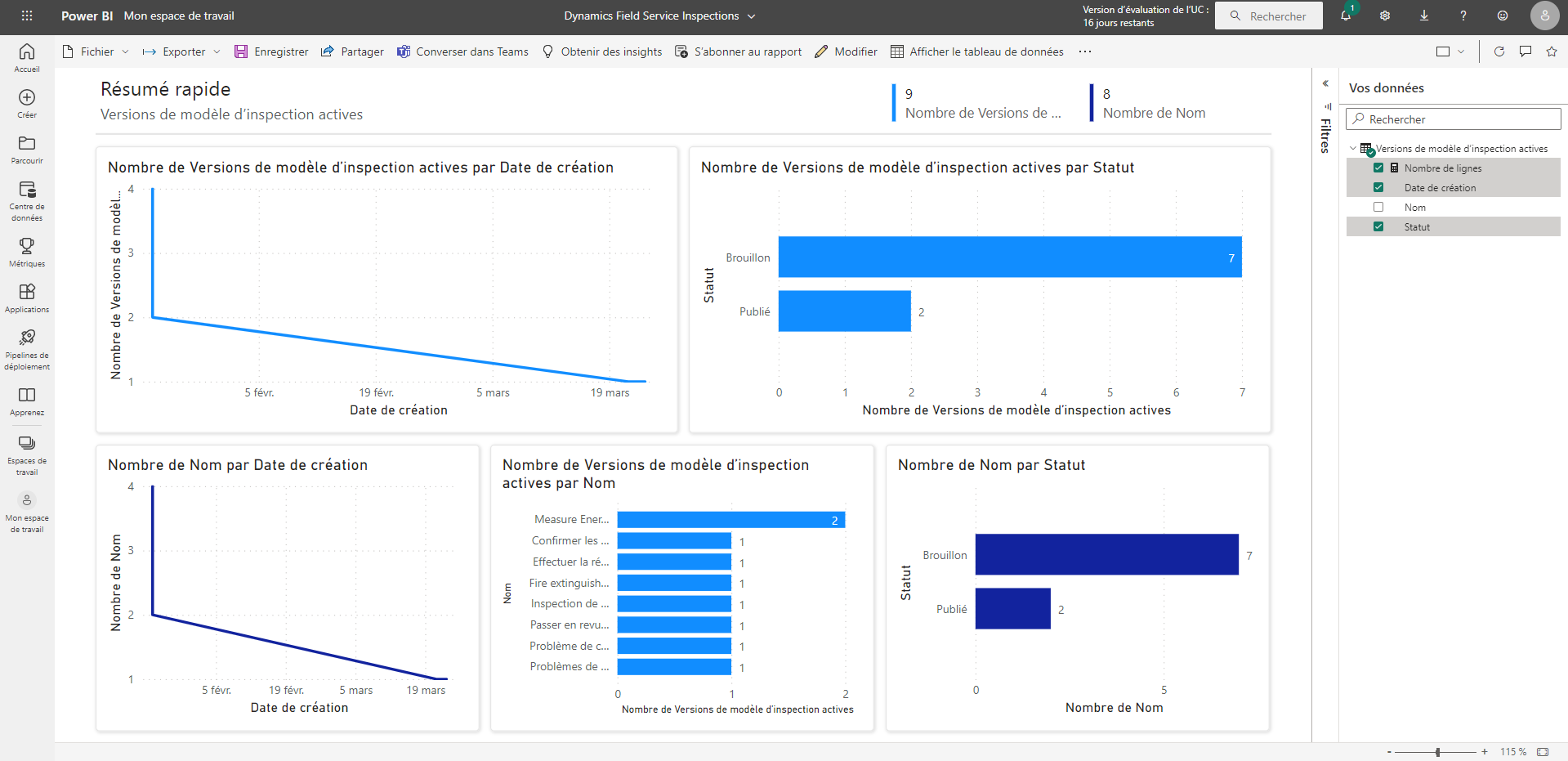 Aucun état ou tableau de bord prêt à l’emploi n’est fourni. Vous devez créer vos propres visualisations. Nous vous recommandons d’utiliser Microsoft Power BI. La capture d’écran suivante montre un exemple de tableau de bord Power BI pour des inspections.