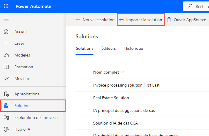 Cliquez sur Solutions > Importer la solution.