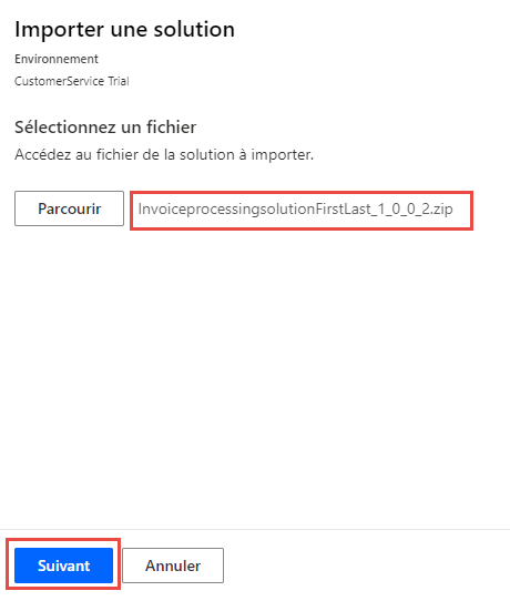 Sélectionnez le fichier de solution InvoiceprocessingsolutionFirstLast_1_0_0_2.zip situé dans le dossier des ressources, puis cliquez sur Ouvrir.