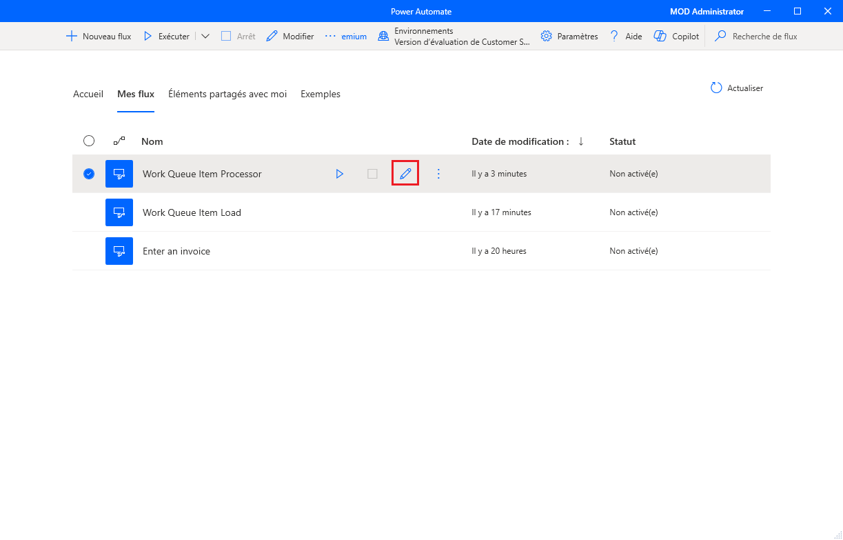 Sélectionnez le nouveau flux Processeur des éléments de la file d’attente de tâches et cliquez sur l’icône représentant un crayon pour le modifier.