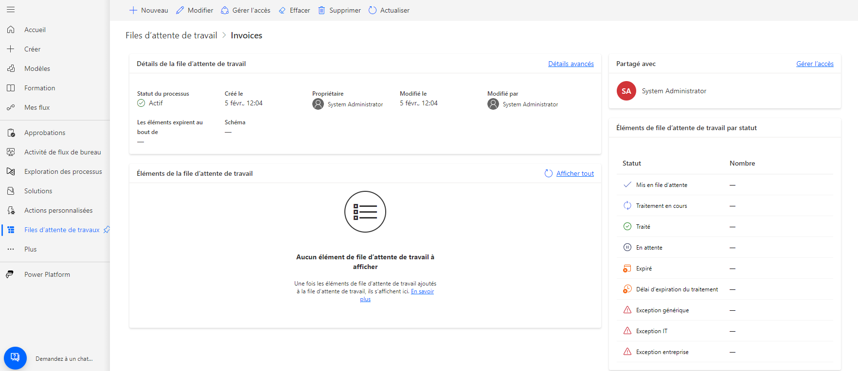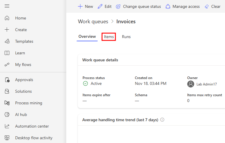 Revenez dans le navigateur web Power Automate, à la file d’attente de tâches Factures précédemment visitée. Actualisez le navigateur et accédez à l’onglet Éléments.