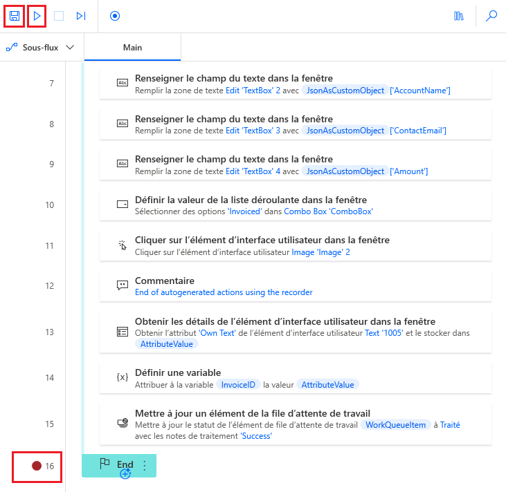 Si la ligne 16 comporte un Point d’arrêt, supprimez-le. Cliquez sur Enregistrer et Exécuter une dernière fois pour afficher tous les éléments de la file d’attente de tâches traités par ce flux.