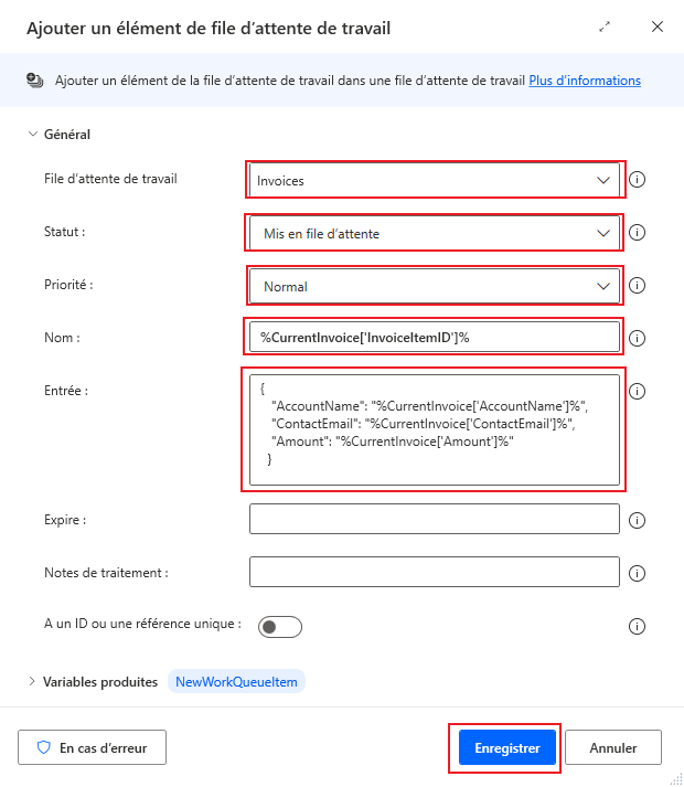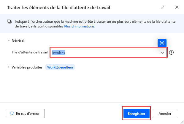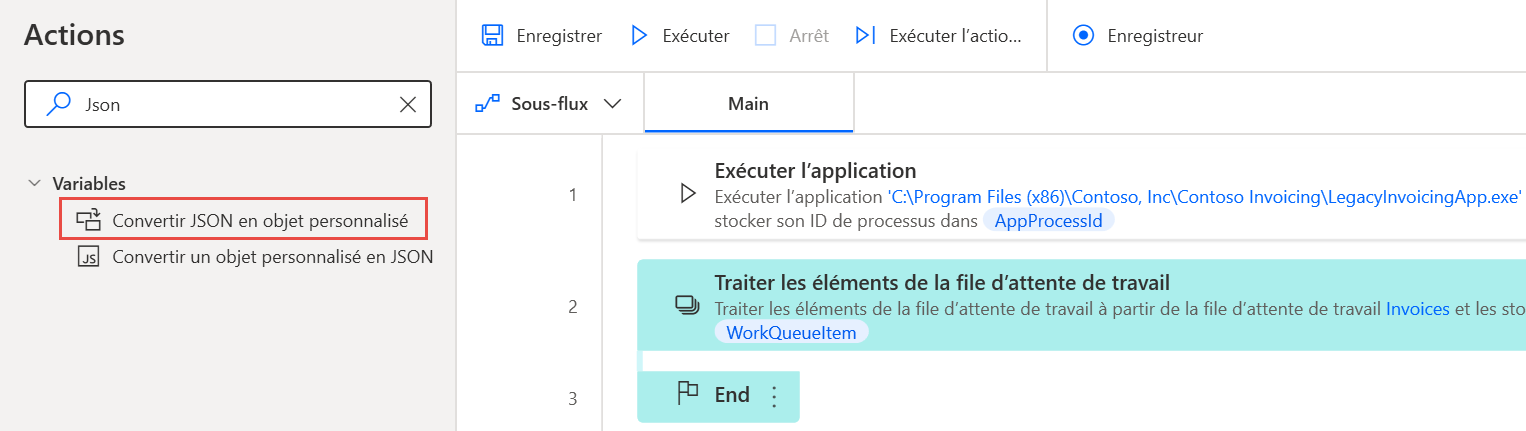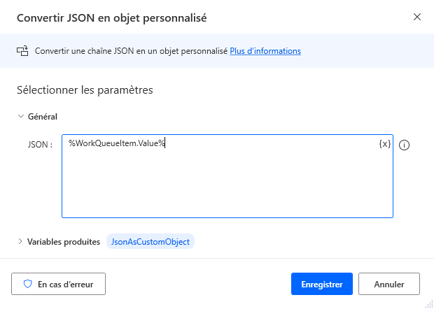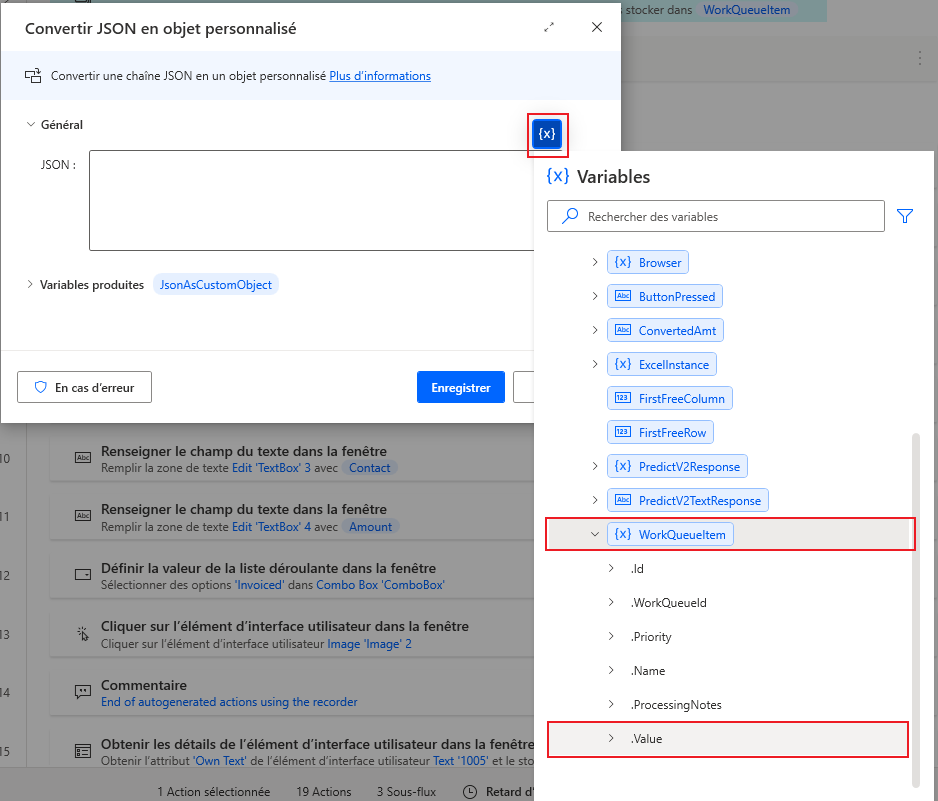 Jsonet sélectionnez l’action Convertir JSON en objet personnalisé, en veillant à l’ajouter dans la boucle Traiter les éléments de la file d’attente de tâches venant d’être créée.Cliquez sur l’icône de variable {x} pour choisir la valeur JSON à convertir. Dans la liste déroulante, faites défiler vers le bas et cliquez sur la flèche de développement pour WorkQueueItem, puis sélectionnez l’option .Value. Cliquez sur Sélectionner pour l’ajouter à la zone des paramètres. Une fois l’ajout effectué, cliquez sur Enregistrer.