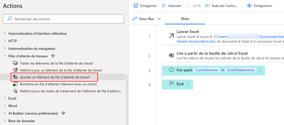 Accédez à la section Files d’attente de tâches dans le volet Actions et sélectionnez l’action Ajouter un élément de file d’attente de tâches. Veillez à faire glisser l’action dans la boucle For each.
