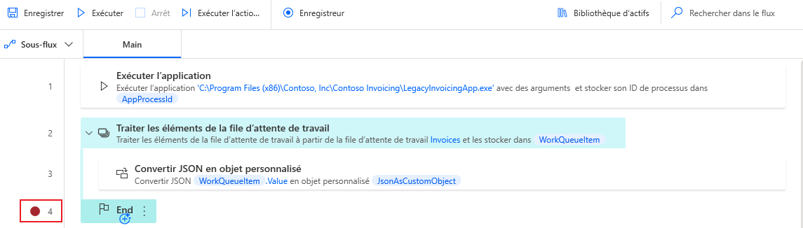 Sélectionnez le chiffre 4 dans la liste des actions pour ajouter un Point d’arrêt au flux. Ce point d’arrêt arrête le flux à l’action pour laquelle il est ajouté, puis permet aux utilisateurs de visualiser les détails du flux à ce stade.