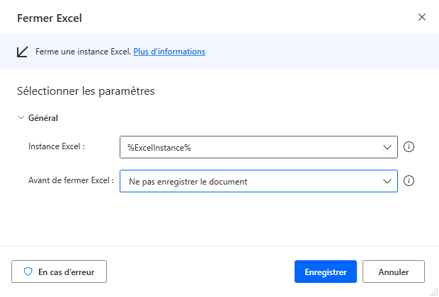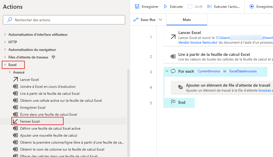 Accédez à la section Excel dans le volet Actions et ajoutez l’action Fermer Excel comme dernière étape du flux, en dehors de la boucle For each. Vous n’avez pas besoin d’apporter de modifications à cette action.