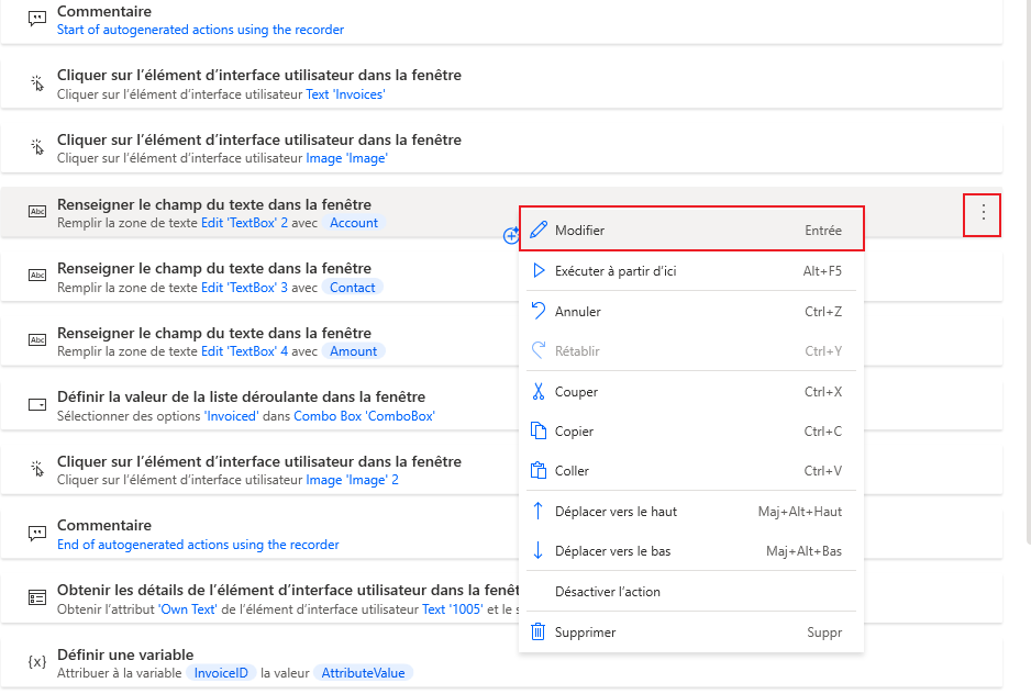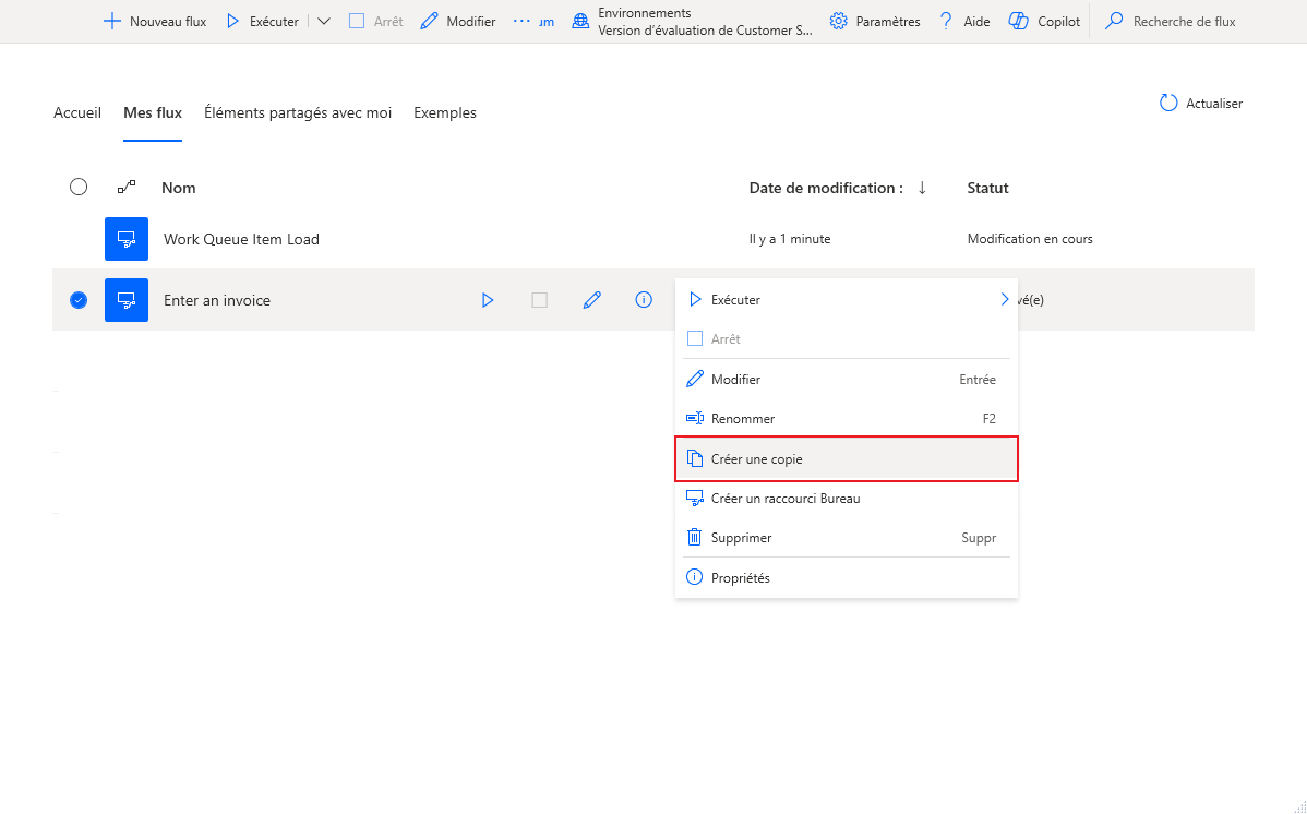 Cliquez sur les points de suspension pour le flux Saisir une facture créé dans un labo précédent et sélectionnez Créer une copie dans la liste déroulante.