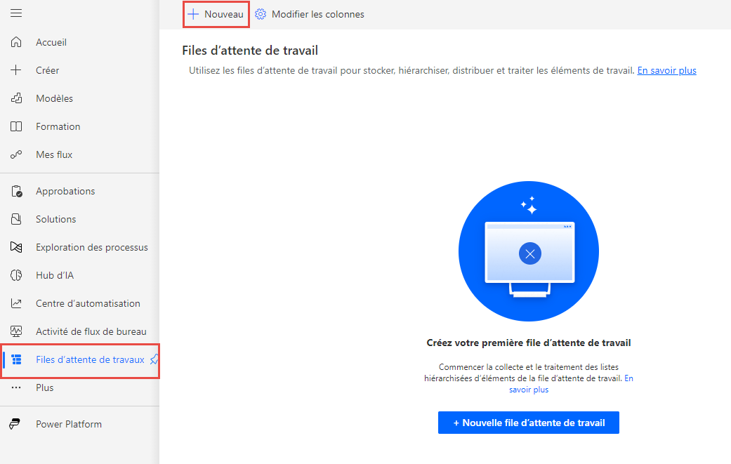 L’utilisateur est alors redirigé vers la section Files d’attente de tâches. Cliquez sur le bouton + Nouvelle file d’attente de tâches ou + Nouveau en haut de l’écran pour créer une file d’attente de tâches.