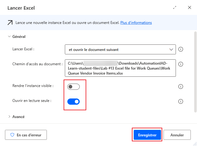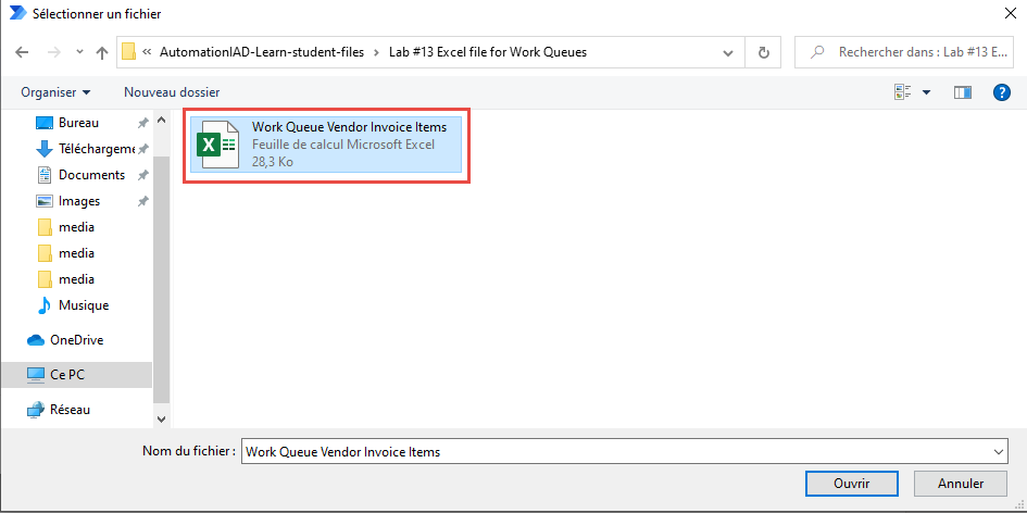 Redéfinissez le champ Chemin d’accès au document et sélectionnez le fichier nommé Work Queue Vendor Invoice Items dans le dossier Lab #13 Excel file for Work Queues dans les supports de cours.