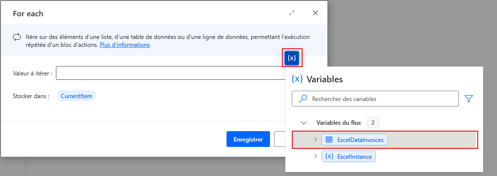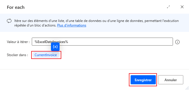 Cliquez sur l’icône de variable pour choisir la variable ExcelDataInvoices sur laquelle effectuer une itération, puis redéfinissez le nom de la variable dans laquelle les données sont stockées sur CurrentInvoice et cliquez sur Enregistrer.