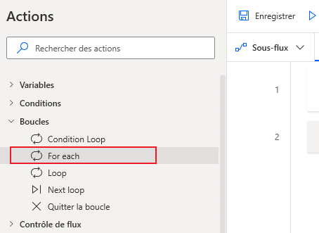 Accédez à la section Actions de boucle et sélectionnez l’action de boucle For each.