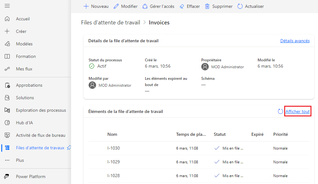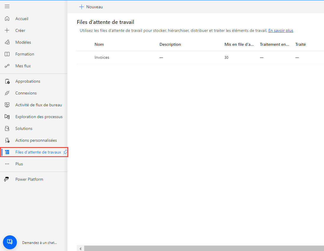 Accédez au portail de flux de cloud Power Automate sur make.powerautomate.com, cliquez sur Plus, puis choisissez Files d’attente de tâches dans le menu. Notez les 30 éléments mis en file d’attente pour la file d’attente de tâches Factures.