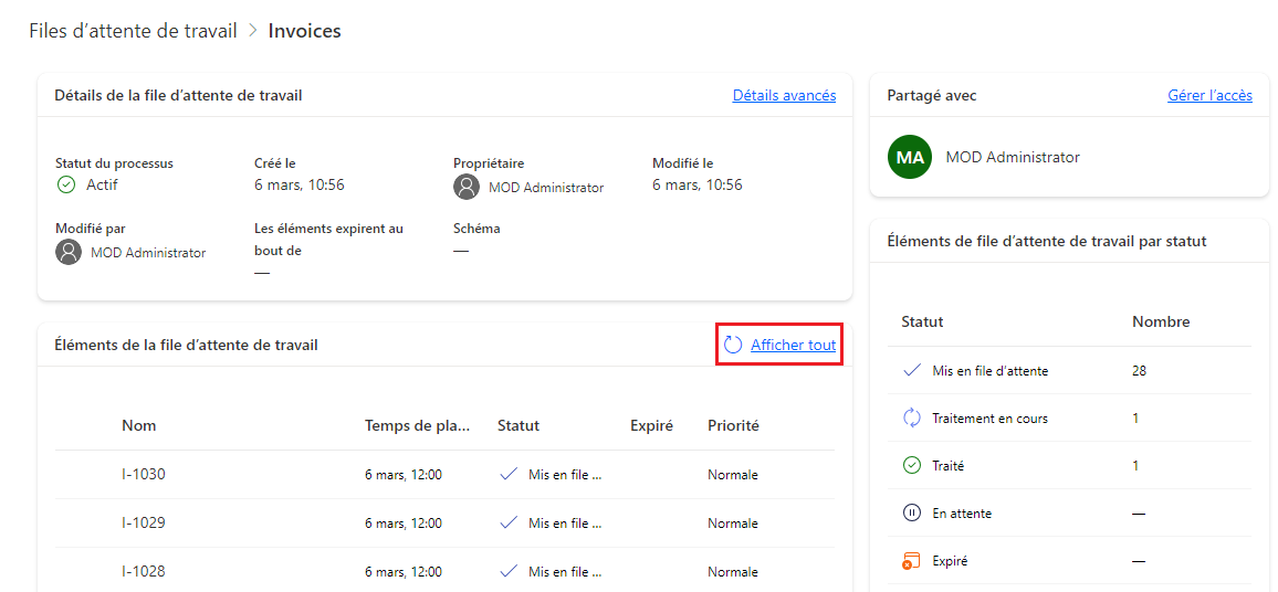 Sélectionnez la file d’attente de tâches Factures et accédez à l’onglet Éléments pour afficher la liste complète des éléments mis en file d’attente par le flux de travail récemment exécuté.