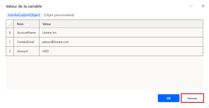 Double-cliquez sur la variable JsonAsCustomObject dans la zone Variables de flux du volet Variables pour afficher les détails de sortie du flux en cours d’exécution.