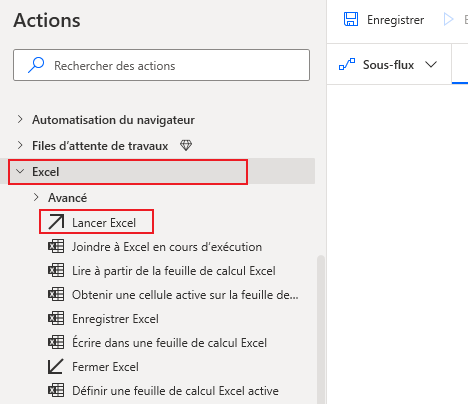 Une fois dans le concepteur Power Automate pour le bureau, accédez à la section Excel et sélectionnez l’action Lancer Excel à ajouter comme première étape du flux de travail.
