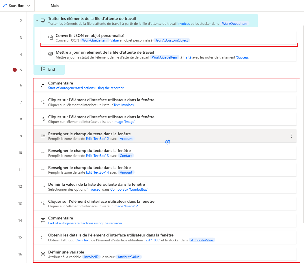 En maintenant la touche Ctrl de votre clavier enfoncée, sélectionnez toutes les actions du flux de bureau Saisir une facture d’origine, puis faites glisser toutes ces étapes dans la boucle Traiter les éléments de la file d’attente de tâches, entre les actions Convertir JSON en objet personnalisé et Mettre à jour l’élément de la file d’attente de tâches.